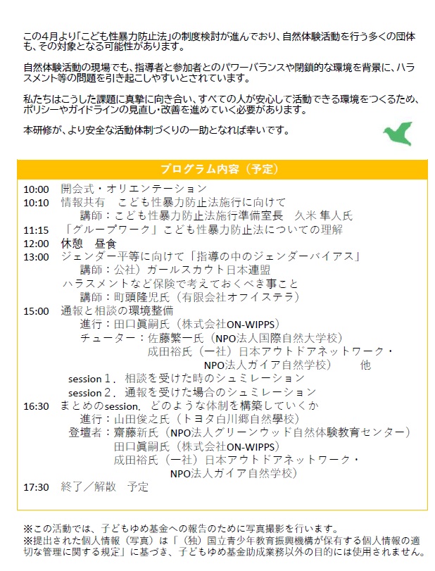 この度、こども性暴力防止法((学校設置者等及び民間教育保育等事業者による児童対象性暴力等の防止等のための措置に関する法律)の施行を前に、「自然体験活動のセーフティーネット」~子どもと指導者をまもる「安全と理解、予防、報告、対応の4つの柱」~を開催することになりました。